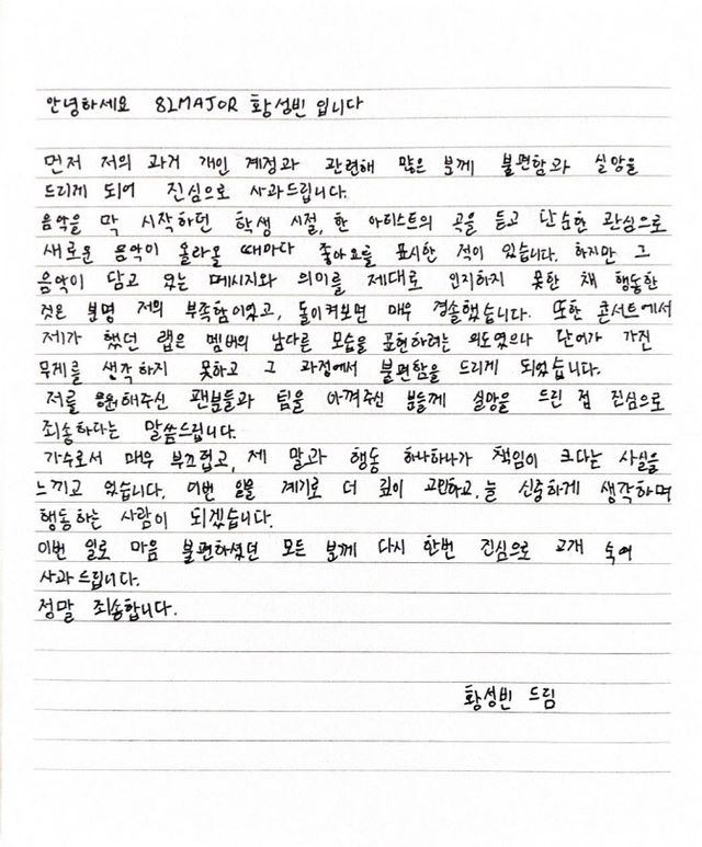 끝으로 황성빈은 “가수로서 매우 부끄럽고, 제 말과 행동 하나하나가 책임이 크다는 사실을 느끼고 있다. 이번 일을 계기로 더 깊이 고민하고, 늘 신중하게 생각하며 행동하는 사람이 되겠다”며 “이번 일로 마음 불편하셨던 모든 분께 다시 한번 진심으로 고개 숙여 사과드린다”고 전했다.