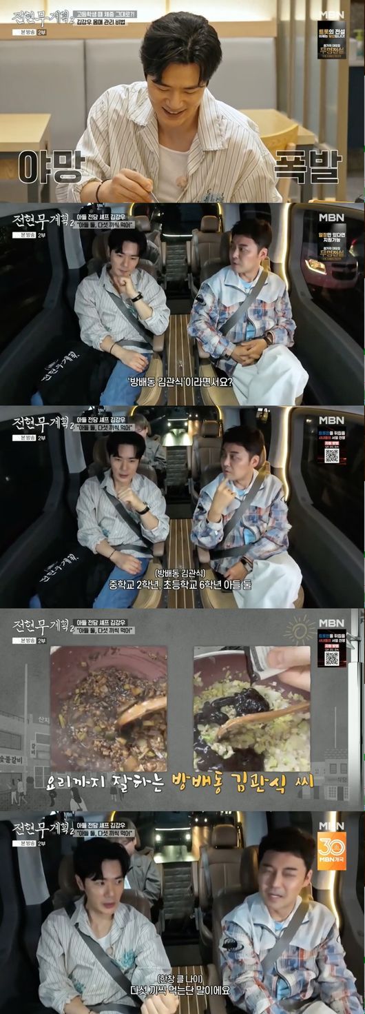 식비가 많이 들겠다는 전현무의 말에 김강우는 "엄청 많이 든다. 고기도 거의 근으로 시킨다"고 혀를 내둘렀다. 아이들에게 밥도 직접 해준다는 그는 "중식도 많이 해주고. (이연복) 셰프님한테 같이 방송하면서 배운 게 있어서 짜장밥이나 마파두부나. 저희는 아들이 둘이라 방학 때는 다섯 끼씩 먹는다. 그것만 해도 엄청나다"고 말해 현실 육아의 어려움을 실감케 했다.