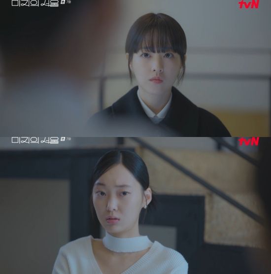 14일 방송된 tvN 토일드라마 '미지의 서울' 7회에서는 박지윤(유유진 분)이 유미지(박보영)에게 유미래(박보영)가 불륜 스캔들을 겪었다고 밝힌 모습이 그려졌다.