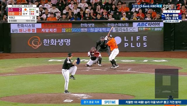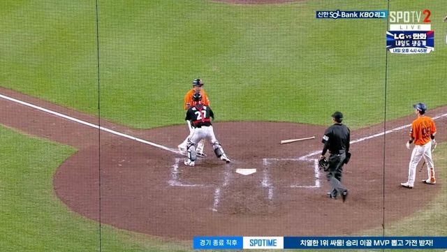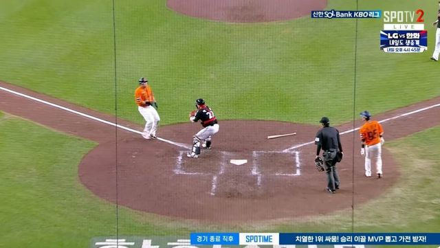 14일 LG와 한화의 연장 11회말 2아웃 상황에서 이재원이 좌익수 앞 안타를 치자 2루에 있던 주자 안치홍은 3루를 돌아 홈으로 쇄도했다. 그 결과 아웃 그리고 경기 종료. / SPOTV2-유튜브 'TVING SPORTS'