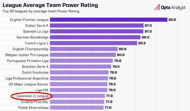 리그 내 상위 10위 팀 평균 점수를 기반으로 한 파워랭킹에서도 J1리그는 15위에 들며 세계적으로도 경쟁력 있는 리그라는 걸 입증했다. 이 기준에서는 사우디 리그가 18위에 올라 순위를 크게 끌어올렸다.