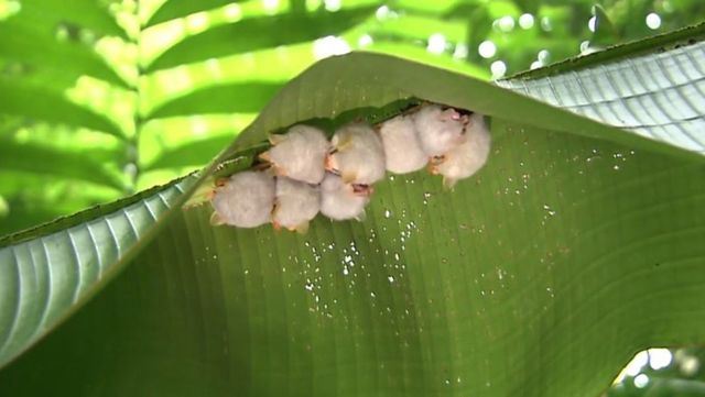 잎에 매달린 '온두라스 흰박쥐'들의 모습. / 유튜브 'KBS동물티비 : 애니멀포유 animal4u'