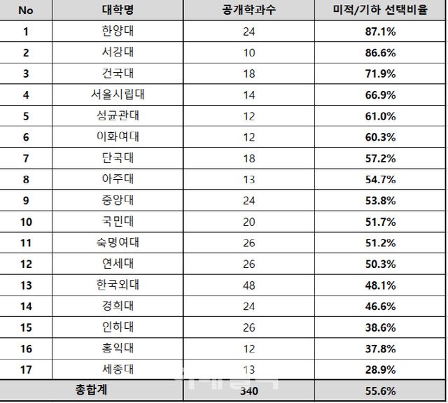 분석 결과 17개 대학의 인문계 학과 합격생 중 이과생 비율은 평균 55.6%로 집계됐다. 한양대가 87.1%로 가장 많았으며 △서강대 86.6% △건국대 71.9% △서울시립대 66.9% △성균관대 61% △이화여대 60.3% △단국대 57.2% △아주대 54.7% △중앙대 53.8% △국민대 51.7% △숙명여대 51.2% △연세대 50.3% 순이다. 서울대와 고려대는 관련 정보를 공개하지 않아 제외했다.