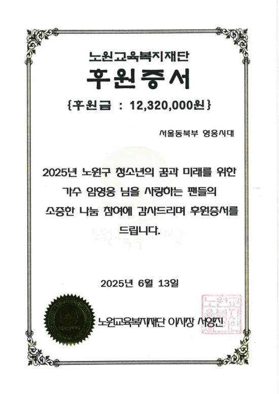 오승록 노원구청장은 "좋아하는 가수를 향한 마음을 따뜻한 나눔으로 실천해 주신 '서울동북부영웅시대' 여러분께 깊이 감사드린다"라고 말했다. 이어 "기탁해주신 장학금은 청소년들에게 큰 응원과 희망이 될 수 있도록 잘 전달하겠다"라고 약속했다.