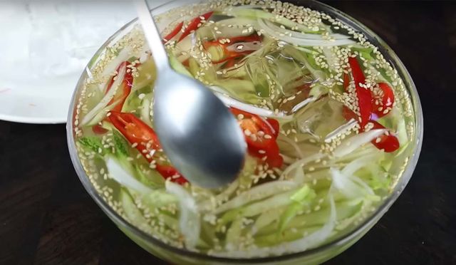 육수는 다시마물 1리터에 냉면 육수 2봉지, 구운소금 1숟갈, 식초 2숟갈, 매실청 3숟갈, 맛술 3숟갈을 첨가해 만든다. 모든 재료를 잘 섞은 후 썰어둔 채소들을 넣고 참깨를 살짝 뿌려 완성한다.