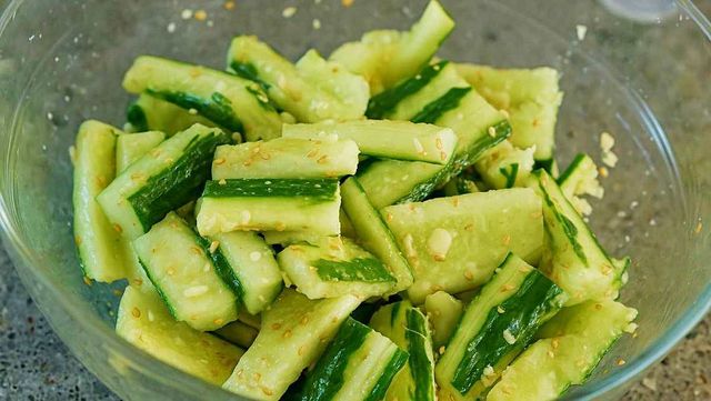 여기서 얼음물에 5분 정도 담갔다가 꺼내면 더 아삭한 식감을 살릴 수 있다. 이후 볼에 두드린 오이를 넣고, 소금 1/2큰술, 설탕 1큰술, 식초 1~2큰술(3배 식초 기준), 다진 마늘, 참깨(으깬 것과 통깨 반반) 등을 넣고 고루 버무린다. 기호에 따라 청양고추를 썰어 넣거나 고춧가루를 뿌리면 매콤한 풍미도 더할 수 있다. 버무린 후 20~30분 정도 숙성시키면 양념이 깊게 배어 더 맛있어진다.