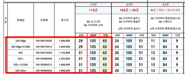 지난 13일부터 상향된 이른바 ‘성지’들의 지원금 상황을 보면, 갤럭시S25 기준 KT는 105~109만원의 번호이동 지원금을, LG유플러스는 110~120만원의 번호이동 지원금을 지급했다.