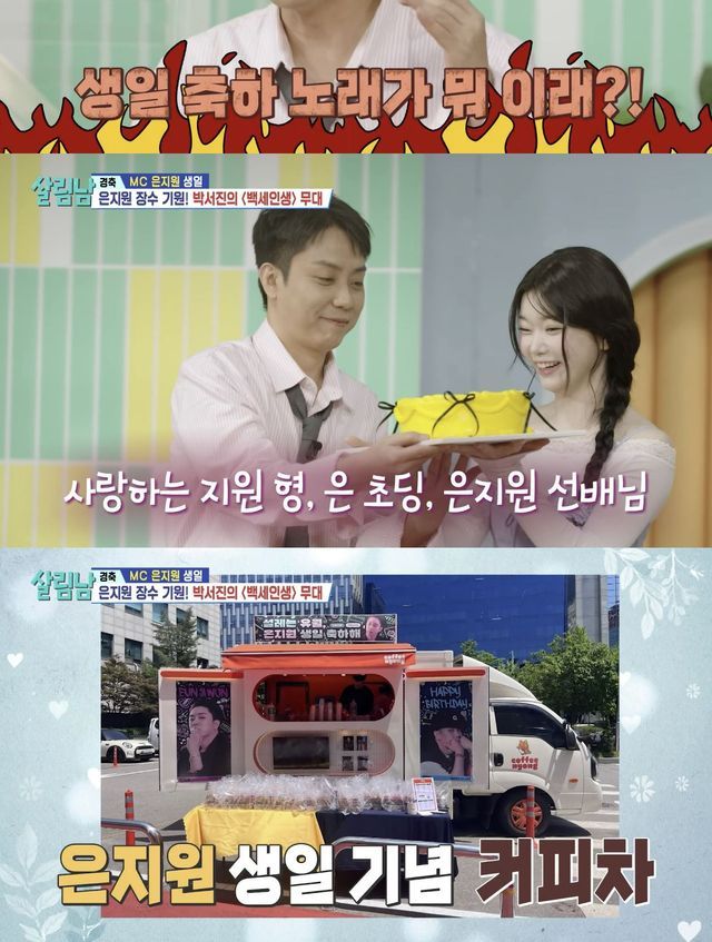 '살림남' MC로 활약 중인 은지원은 이날 생일을 맞아 제작진, 출연진, 팬들에게 축하를 받았다. 은지원은 '백세인생' 가사를 듣다 "가사가 뭐 이래?", "이거 먹이는 노래 아니야?"라고 물으면서도 박서진의 노래를 즐겼다.