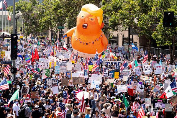 도널드 트럼프 대통령이 14일(현지 시각) 워싱턴에서 육군 창건 250주년 및 자신의 79세 생일을 축하하는 대규모 군사 퍼레이드를 벌인 날 로스앤젤레스(LA)에서는 ‘노 킹스’와 불법이민자 단속에 항의하는 시위로 얼룩졌다.