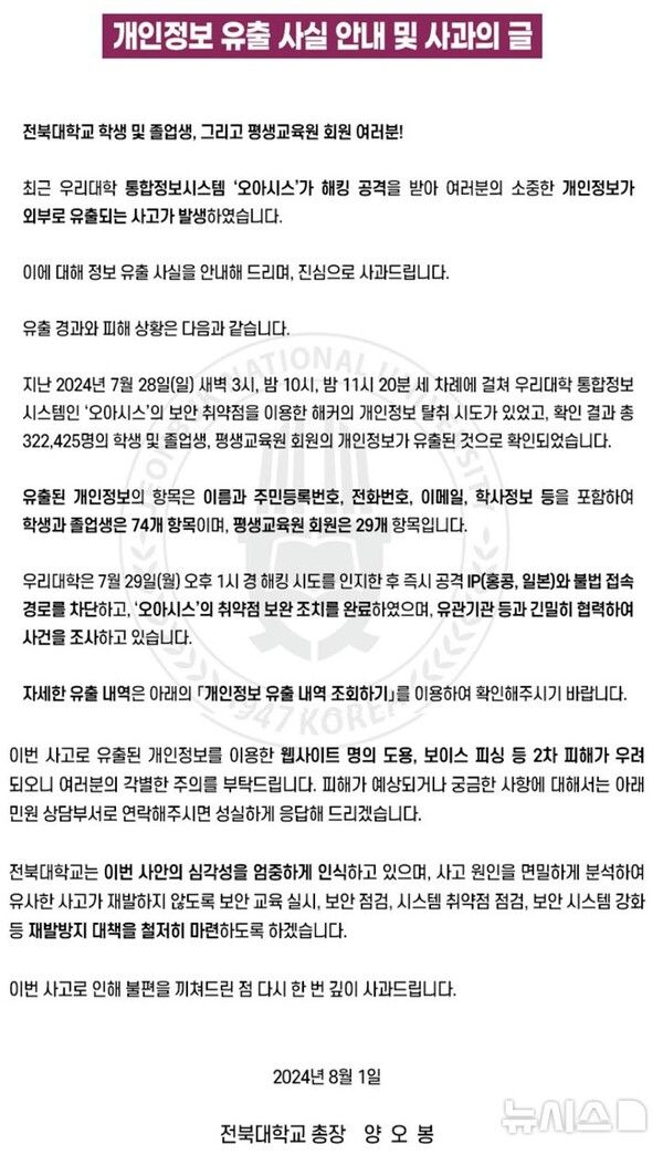 해킹 공격으로 인해 재학생, 졸업생, 평생교육원 회원 등 모두 32만2425명의 개인정보가 유출됐다.