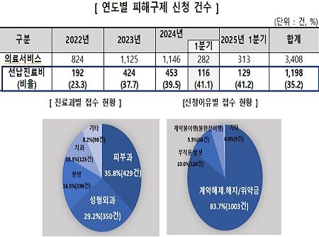 한국소비자원(원장 윤수현)이 지난 11일 발표한 자료에 따르면 최근 3년간(2022년~2025년 1분기) 의료서비스 선납진료비 관련 피해구제 접수 건수는 2022년 192건에서 2023년 424건, 2024년 453건으로 꾸준히 늘어났으며, 2025년 1분기에도 129건이 접수됐다.