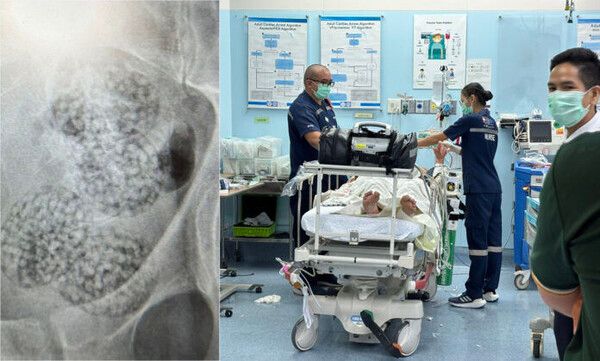 의료진은 환자의 항문에서 분홍색 액체가 흘러나오는 것을 확인했고, CT 촬영 결과 장 속에 여러 개의 구형 물체가 존재한다는 사실을 발견했다.