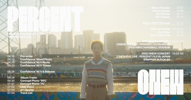 프로모션 플랜에 따르면, 온유는 7월 15일 정규 2집 'PERCENT' 발매에 앞서 6월 24일 수록곡 'Confidence'를 선공개한다. 'Confidence'의 경우, 음원 발매뿐 아니라 뮤직비디오도 동시 공개될 예정이어서 기대를 모은다.