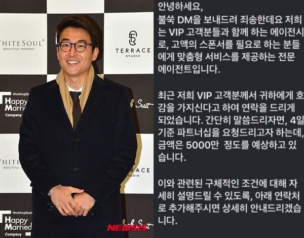 DM에는 "안녕하세요. 불쑥 DM을 보내드려 죄송한데요. 저희는 VIP 고객분들과 함께하는 에이전시로 고액의 스폰서를 필요로 하는 분들에게 맞춤형 서비스를 제공하는 전문 에이전트입니다"라고 적혀있다.