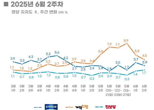 에너지경제가 여론조사기관 리얼미터에 의뢰해 지난 9~13일 전국 만 18세 이상 남녀 2507명을 대상으로 실시한 정당 지지도 조사에서 더불어민주당 49.9%(1.9%P↑), 국민의힘 30.4%(4.4%P↓), 개혁신당 4.5%(1.3%P↓), 조국혁신당 2.9%(0.8%P↓), 진보당 1.7%(0.3%P↑) 등으로 나타났다.