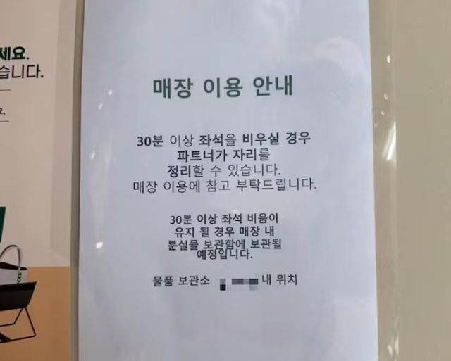 해당 안내문에는 "30분 이상 좌석을 비우실 경우 파트너가 자리를 정리할 수 있습니다. 30분 이상 좌석 비움이 유지될 경우 매장 내 분실물 보관함에 보관될 예정입니다"란 내용이 담겼다.