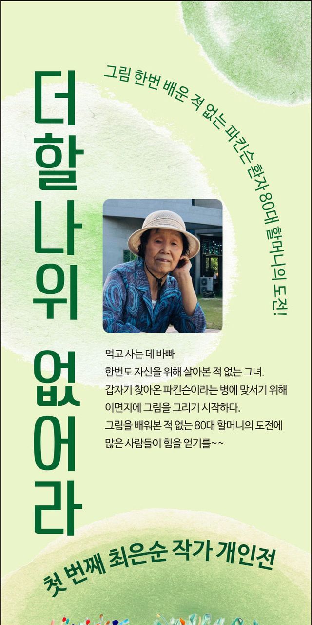 파킨슨병으로 투병 중인 80대 여성 최은순 씨가 6월 22일까지 담양문화회관 1층 전시실에서 생애 첫 개인전을 개최한다.