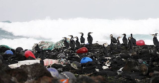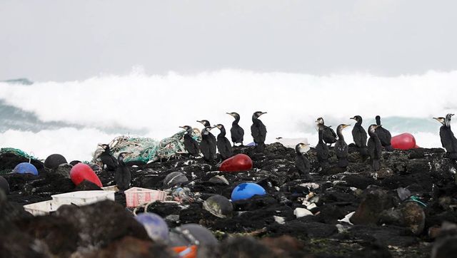 제주시 한경면 해안가에 북서풍 영향으로 떠밀려온 폐어구 등 각종 플라스틱 해양폐기물들이 널브러져있고 한쪽에는 가마우지가 강풍을 피해 앉아있다. 자료 사진 / 뉴스1
