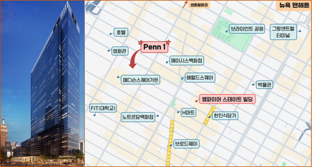 펜 1 빌딩은 뉴욕의 교통 요충지인 펜 스테이션(Penn Station)과 모이니한 트레인 홀(Moynihan Train Hall) 인근에 위치해 있으며, 엠파이어 스테이트 빌딩에서 불과 3블록 떨어져 있다. 델(Dell), 엠파이어 헬스, 모건 스탠리, 웰스파고 등 글로벌 대기업이 입주해 있는 이 지역은 '맨해튼의 금싸라기 땅'으로 불릴 만큼 상징성과 접근성이 높은 곳이다.