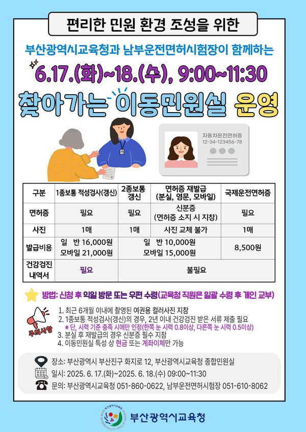 이번 이동민원실은 운전면허시험장을 방문하기 어려운 시민들이 부산시교육청 종합민원실에서 보다 쉽고 신속하게 운전면허증 갱신, 재발급, 국제운전면허증 발급 등 각종 민원 업무를 처리할 수 있도록 마련됐다.