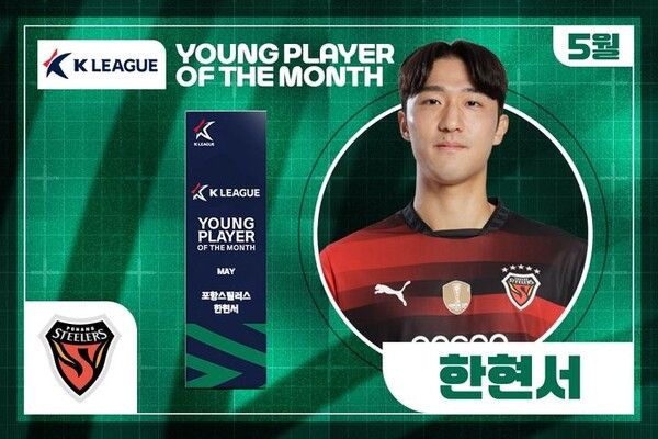 프로축구 K리그를 총괄하는 한국프로축구연맹이 포항 스틸러스 수비수 한현서가 5월 '이달의 영플레이어상'을 수상했다고 16일 밝혔다.