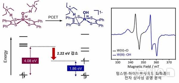 연구팀은 실험을 통해 텅스텐 착화합물 내에서 약산성 물질이 금속에 결합된 산소(W=O)와 디티올렌 분자의 황(S) 원자 두 곳에 동시에 수소 결합을 형성하며, 이를 통해 전자와 양성자가 함께 이동해 수소 발생 반응이 원활히 일어나는 전자 구조가 만들어진다는 것을 세계 최초로 입증했다.