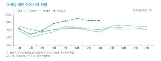 한국농촌경제연구원 농업관측센터 2025년 6월호 축산관측(산란계) 보고서 속 '6~8월 계란 산지가격 전망' 그래프 / 한국농촌경제연구원 제공