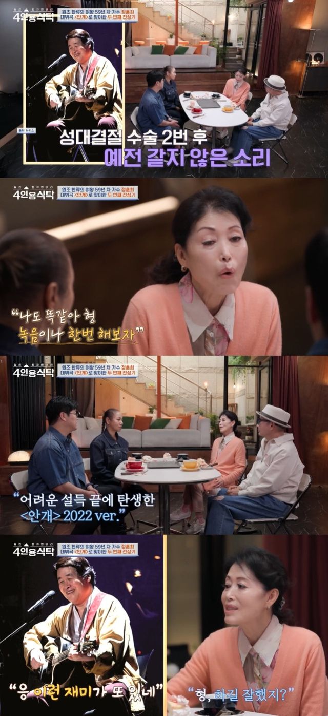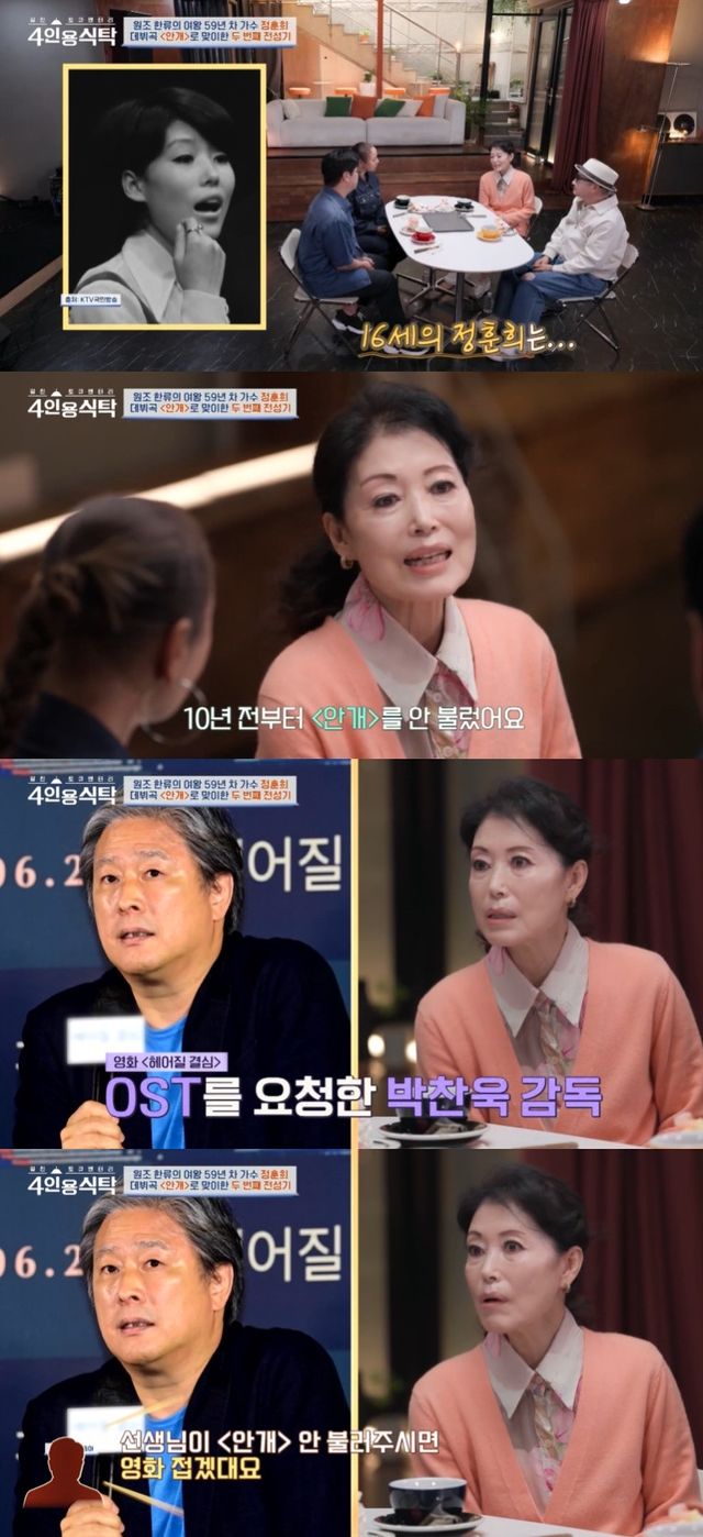 이날 정훈희는 "17살 때 '안개' 부를 땐 철없이 가진 목소리로 낭랑하게 불렀다"며 과거를 회상했다.