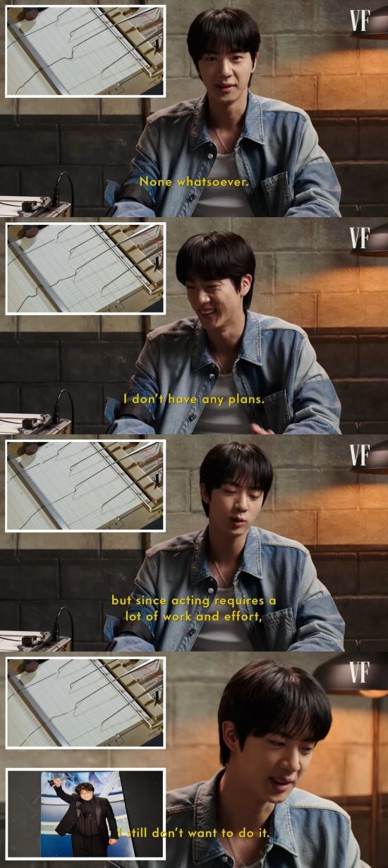 너무 잘생긴 외모 때문에 그런 거냐는 말에 진은 "너무 잘생긴 건 맞지만, 연기를 시도하기까지 굉장히 많은 노력이 필요하기 때문에 도전하기가 무섭다"고 설명했다.