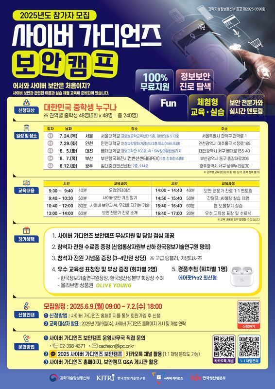 이번 캠프에는 중학생 누구나 신청할 수 있다. 지원자 중에서 회차별로 48명씩 총 240명을 선발하며, 별도의 비용 없이 참가할 수 있다. 단, 여러 회차에 중복 신청은 불가하다. 내달 2일(수) 오후 6시까지 사이버 가디언즈 홈페이지(https://cyberguardians.or.kr)를 통해 신청할 수 있으며, 참가자는 같은 달 9일(수) 발표 예정이다.