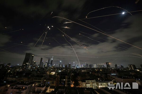 [서울=뉴시스] 15일(현지 시간) 이스라엘 텔아비브 상공에서 이스라엘 방공 시스템 아이언 돔이 이란의 미사일을 요격하고 있다.