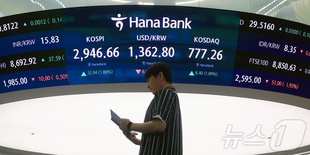 16일 서울 중구 하나은행 본점 딜링룸 전광판에 종가 현황이 표시돼 있다. 이날 코스피는 전 거래일 종가와 비교해 52.04포인트(p)(1.80%) 상승한 2946.66으로 마감했다. 코스닥은 전 거래일 대비 8.40p(1.09%) 상승한 777.26으로 거래를 마쳤다. 서울외환시장에서 달러·원 환율은 전 거래일보다 6.80원 내린 1362.80원으로 거래되고 있다. 2025.6.16/뉴스1