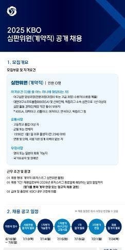 이번 채용은 KBO 야구심판 양성과정 수료자 또는 대한야구소프트볼협회(KBSA) 및 산하단체, 독립리그 소속 심판으로 1년 이상의 심판 활동 경력(단체장 직인 필수) 보유자에 한해서 지원이 가능하다. 최종 합격자는 2025 KBO 공식 심판위원으로 활동하게 되며, 근무 종료 후 평가 결과에 따라 정규직 전환이 검토된다.