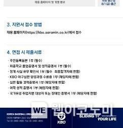 접수 기간은 오늘(6월16일)부터 7월 6일(일)까지며, KBO 채용 홈페이지(kbo.saramin.co.kr)에서 지원 가능하다.