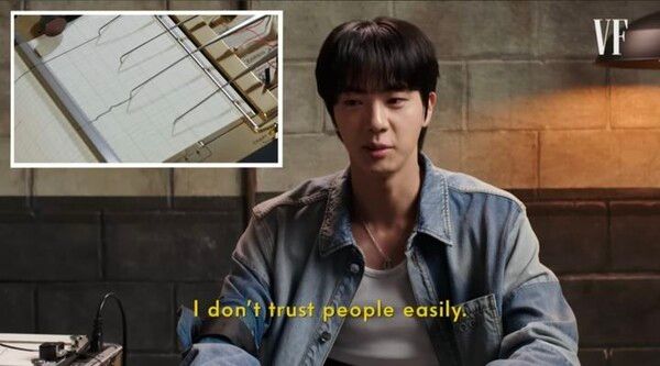 미국의 연예 매거진 베니티 페어의 거짓말 탐지기 인터뷰를 앞둔 진은 "이렇게 무거운 분위기에서 하는 촬영은 처음인지라 긴장된다"고 말했다.