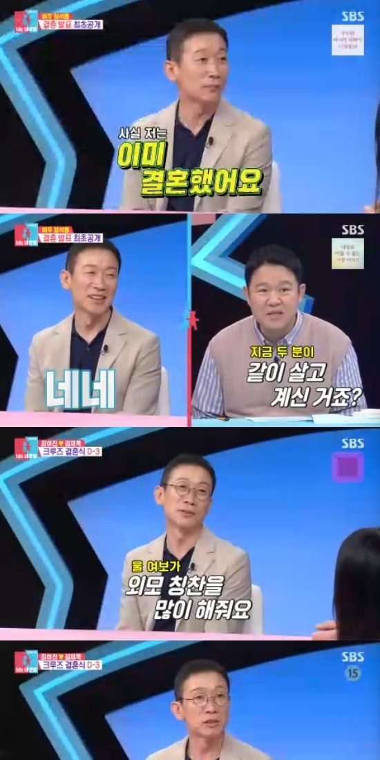 그리고 이날 정석용은 5살 연하의 아내를 언급했다. 정석용은 "'미우새'에서 결혼식장을 구경하는 모습이 나왔다. 방송 후에 기사도 많이 나고, 문자도 많이 받았다. 사실 이미 결혼을 했다. 우리끼리는 결혼을 한 것으로 했다. 이미 같이 살고 있다. 그 친구도 '누가 물어보면 결혼 했다고 해'라고 하더라"면서 웃었다.