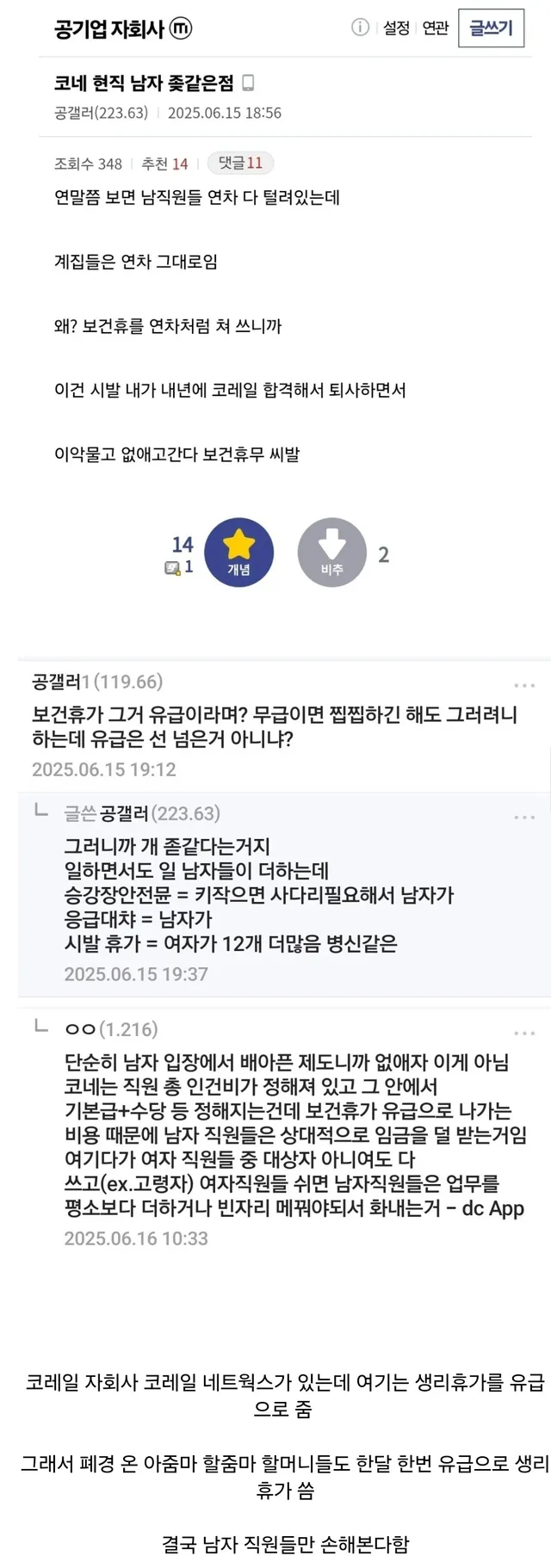 여직원들은 1년에 기본연차에 + 꽁으로 12일 쉬는거네 ㄷㄷ