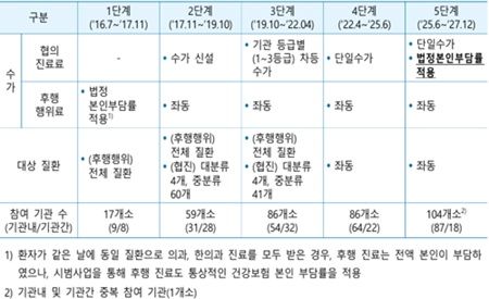 이번 5단계 시범사업에서는 시범사업의 본사업 전환 검토를 위한 효과성·수용성 등 평가를 위해 협의진료료에 대해 법정본인부담률을 적용한다는 점이 특징이다.