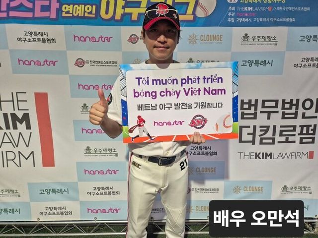 배우 오만석(인터미션)이 베트남 야구발전을 기원하는 팻말을 들고 포즈를 취하고 있다. /한스타미디어
