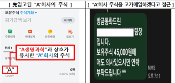 투자자는 증권계좌에 입고된 A회사 주식을 'A생명과학' 주식으로 착각하고 불법 업체가 안내하는 대포통장으로 주식매수대금을 송금했다. 불법 업체는 거액의 재투자를 유도한 후 자금을 편취해 잠적했다.