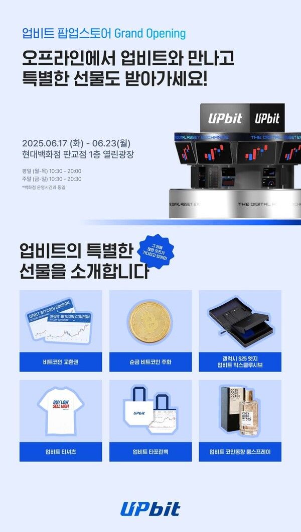 방문객은 이벤트에 참여해 모은 '비트코인(BTC) 모형'을 현장에서 실물 기념품으로 교환할 수 있다. 기념품은 순금 1돈으로 만든 ▲비트코인 기념주화 ▲삼성전자 갤럭시 S25 엣지 업비트 익스클루시브 ▲업비트 비트코인 교환권 ▲업비트 브랜드 굿즈 ▲현대백화점 카페에이치(H) 음료 교환권 등이다.