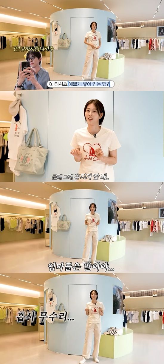 이현이는 "그래서 저는 바지 안에 단단히 다 집어넣고, 앞만 펴서 주름을 다 옆으로 모아준다. 그런 다음에 모양을 잡는다. 다린 것처럼 됐다"라며 티셔츠 코디 노하우를 공개했다.