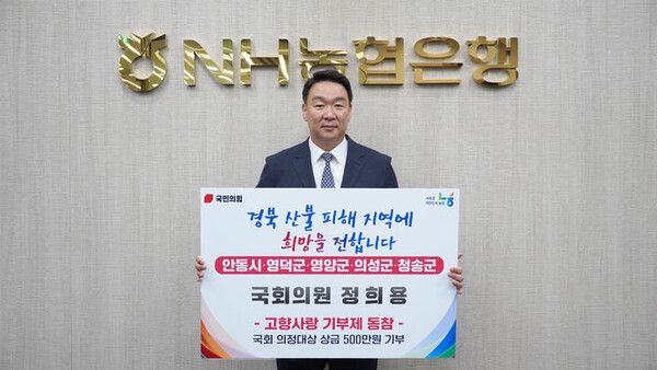 뉴시스 보도에 따르면, 정 의원 측은 이날 보도자료를 통해 제5회 대한민국 국회 의정 대상에서 받은 상금 500만원을 경북 산불 피해 지역 5개 시군(안동시, 영덕군, 영양군, 의성군, 청송군)에 각 100만원씩 고향사랑기부금으로 기부했다고 밝혔다.