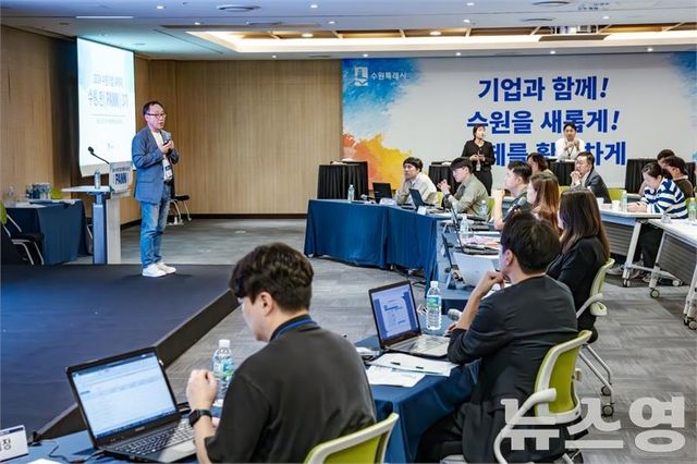 수원시가 지역 기업들을 위해 개최한 IR데이 현장에서 한 기업인이 투자자들 앞에서 발표를 하고 있다./사진=수원시