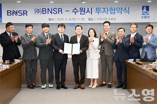 지난 5월 수원시와 ㈜BNSR이 투자협약식을 한 뒤 참석자들이 기념촬영을 하고 있다./사진=수원시