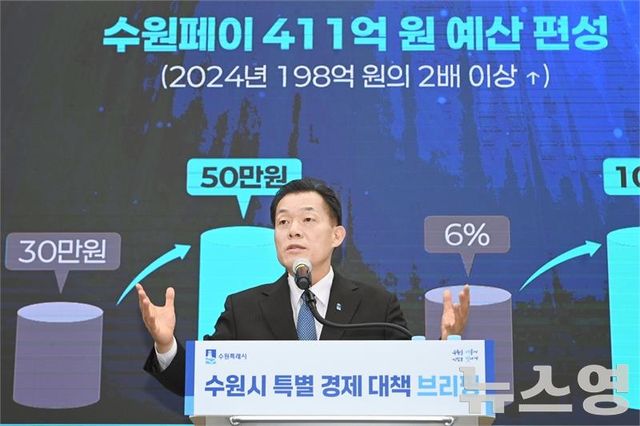 이재준 시장이 지난해 말 ‘특별 경제대책 브리핑’을 열어 수원페이 확대 발행을 발표하고 있다./사진=수원