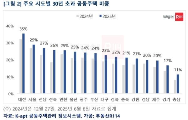 전국적으로 30년 초과 노후 공동주택 비중이 높아지고 있는 가운데 대전이 35%로 전국에서 가장 높은 것으로 나타났다. 이는 전국 평균(22%)을 크게 웃도는 수치며 30%대를 기록한 지역도 대전이 유일하다. 둔산지구를 중심으로 한 노후 계획도시 정비사업에 대한 관심도 다시 한 번 높아질 것으로 보인다.