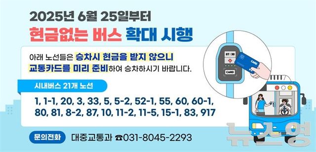 시는 카드 이용이 보편화되고 시내버스 현금 이용률이 0.5~0.6% 수준으로 감소함에 따라, 지난 3월 경기도 최초로 버스노선 1번·917번에 ‘현금없는 버스’를 시범 운행했다. 그동안 발견된 미비점을 보완해 이달 25일부터 확대 시행한다.