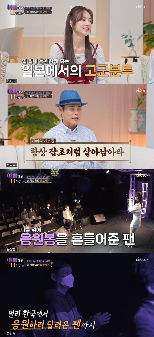 17일 방송된 TV조선 '아빠하고 나하고'에서는 트로트 가수 소명이 트로트 가수이자 딸 소유미의 ‘홍보 요정’을 자처한다. 소유미는 아빠의 그늘에서 벗어나 홀로서기를 위해 일본에서 단독 콘서트를 준비했다.