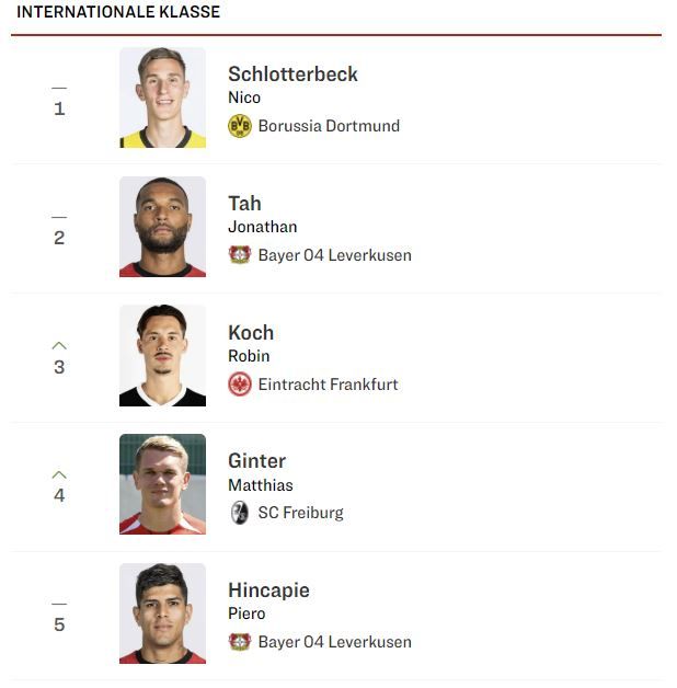 니코 슐로터백(보루시아 도르트문트)가 1위에 이름을 올렸고, 그 뒤로 요나단 타(바이에른 뮌헨), 로빈 코흐(아인트라흐트 프랑크푸르트), 마티아스 긴터(프라이부르크), 피에로 앙카피에(바이엘 레버쿠젠)가 차례로 이름을 올렸다.